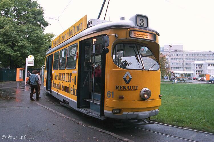 Linz Tram. Tram 61 is a 1970 6-axle articulated vehicle built by Lohner seen at the terminal loop of route 3 just outside the Hauptbahnhof on Wednesday September 25th, 2002. It is advertising Sonnleitner's Renault dealership in Linz.