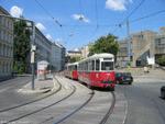 Tramcar E1 4502 with sidecar c3 1202 of tramway vienna on route D to Nußdorf at stop Lichtenwerderplatz.