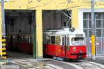 Wien - Straßenbahn - 4505 Triebwagen 4505 auf Linie 6 bei der Ausfahrt aus dem Betriebshof Favoriten in die Gudrunstraße früh morgens am 16. September 2008.