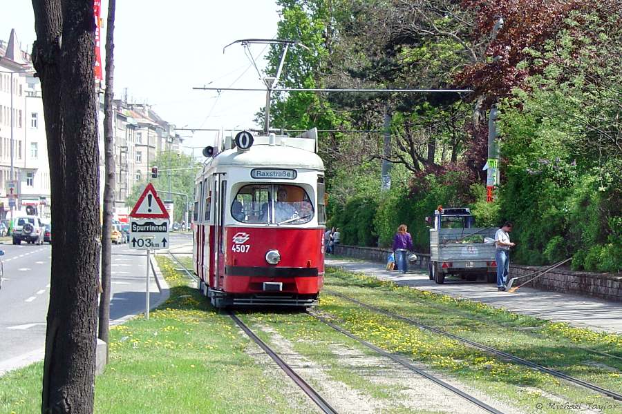 Wien E1 Class 4507 on a westbound route O traveling along the private right-of-way on Äusserer Gürtel on Wednesday April 28th, 2004.