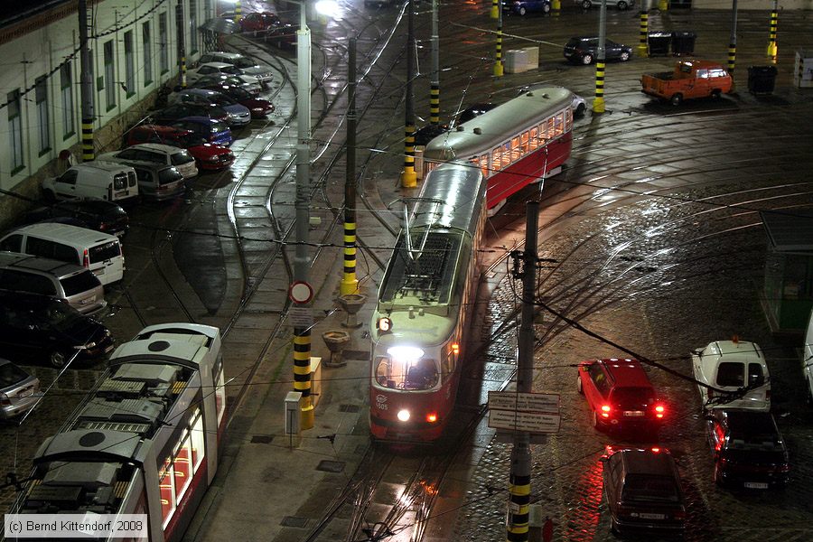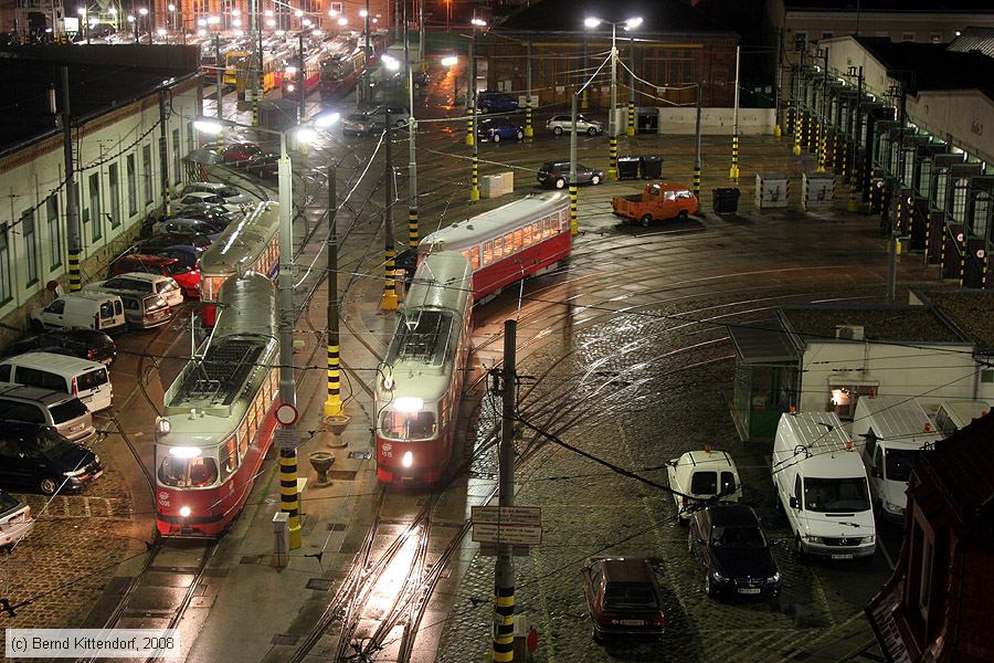 Wien - Straßenbahn - 4506 und 4515 Triebwagen 4506 auf Linie 18 (links im Bild) und 4515 auf Linie O (rechts im Bild) bei der Ausfahrt aus dem Betriebshof Favoriten in die Gudrunstraße früh morgens am 16. September 2008.