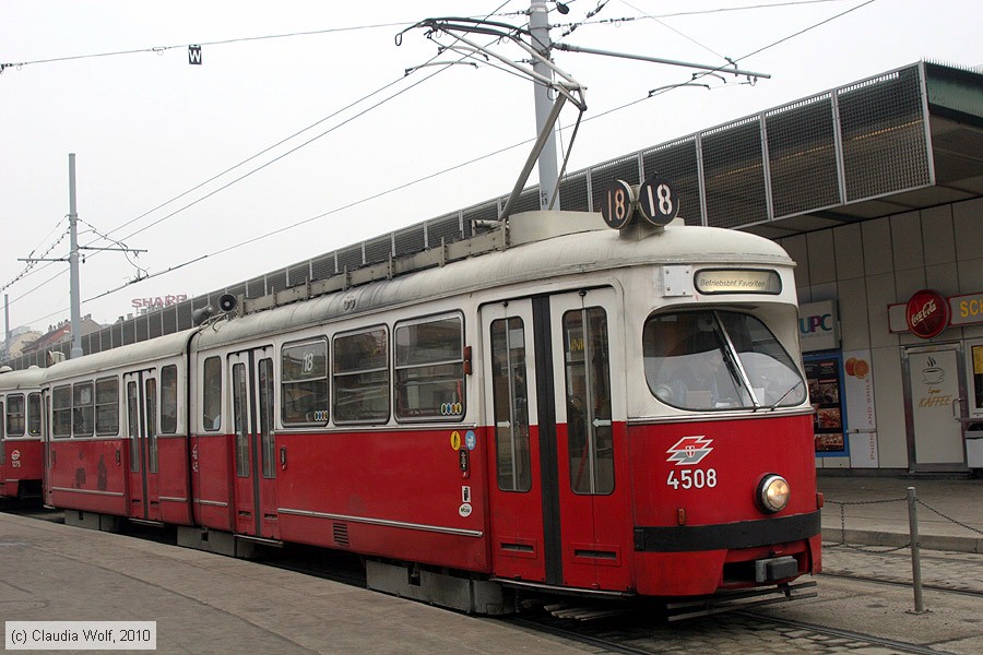 Wien - Straßenbahn - 4508 Triebwagen 4508 auf Linie 18 an der Haltestelle Westbahnhof, aufgenommen am 23. Februar 2010.