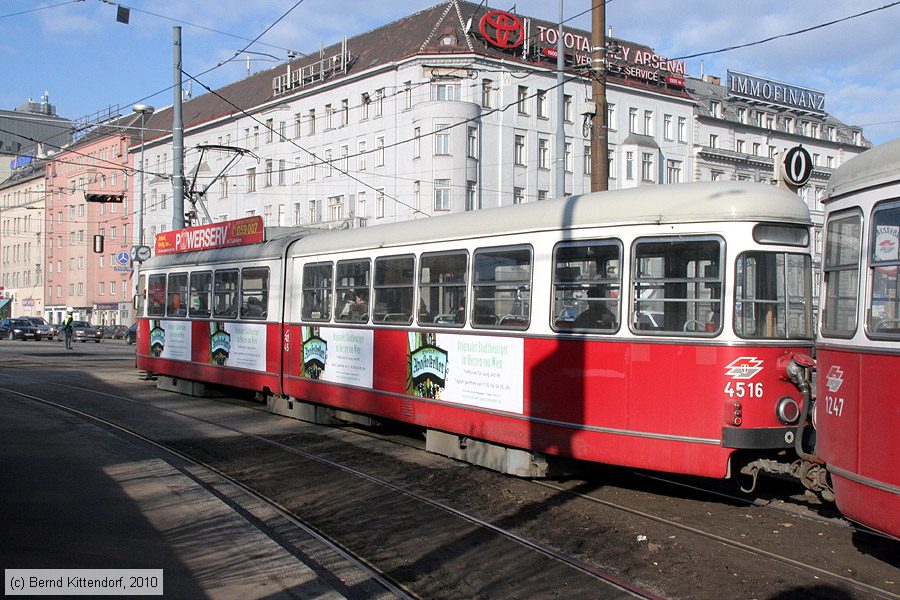 Wien - Straßenbahn - 4516 Triebwagen 4516 auf Linie O an der Haltestelle Südbahnhof am 25. Februar 2010.
