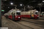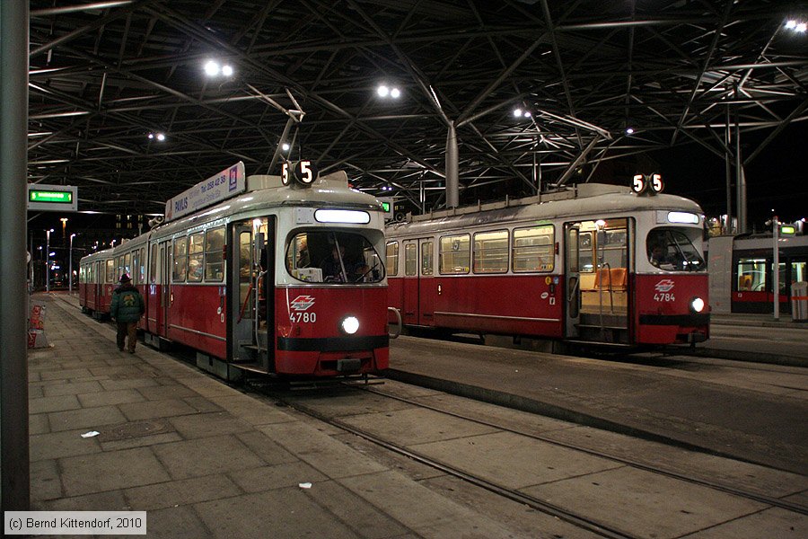 Wien - Straßenbahn - 4780 und 4784 Triebwagen 4780 (links im Bild) und 4784 (rechts im Bild) auf Linie 5 an der Haltestelle Praterstern am Abend des 26. Februar 2010.