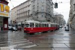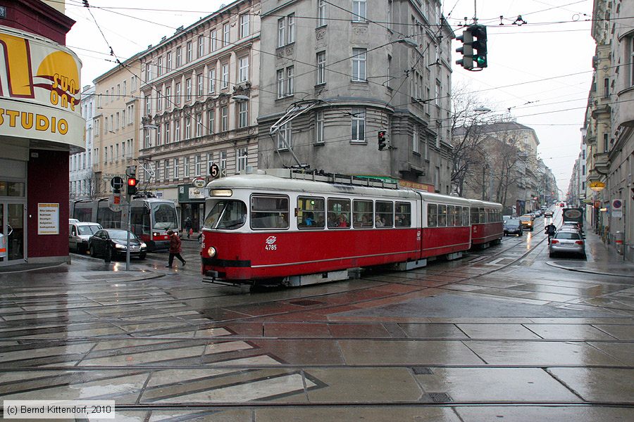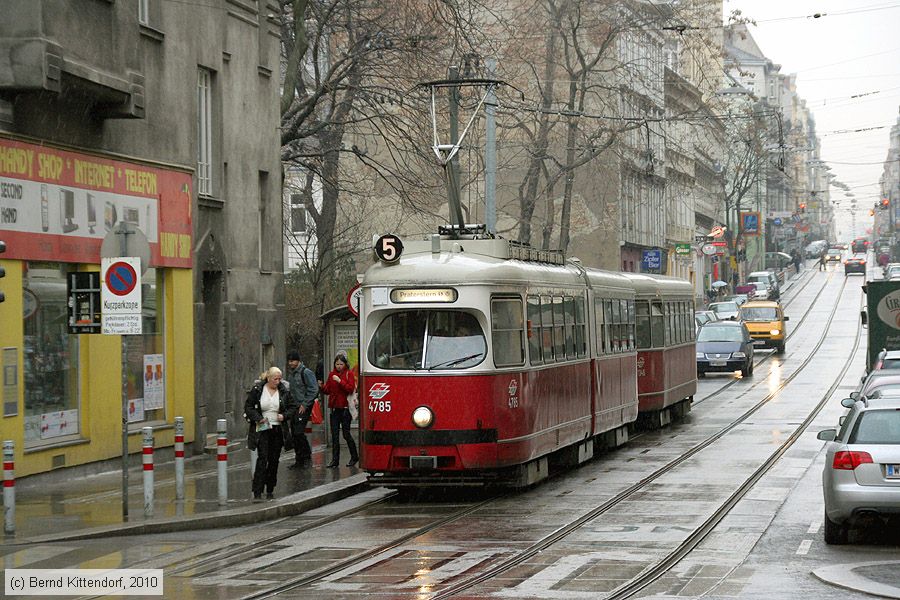 Wien - Straßenbahn - 4785 Triebwagen 4785 auf Linie 5 bei der Haltestelle Lerchenfelder Straße am 26. Februar 2010 während eines Regenschauers. Die Linie kreuzt hier die Strecke der Linie 46.
