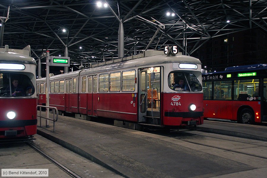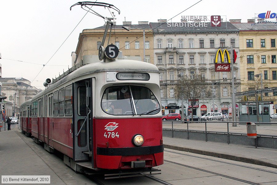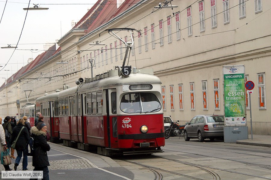 Wien - Straßenbahn - 4784 Triebwagen 4784 auf Linie 5 an der Haltestelle Lange Gasse, aufgenommen am 26. Februar 2010.