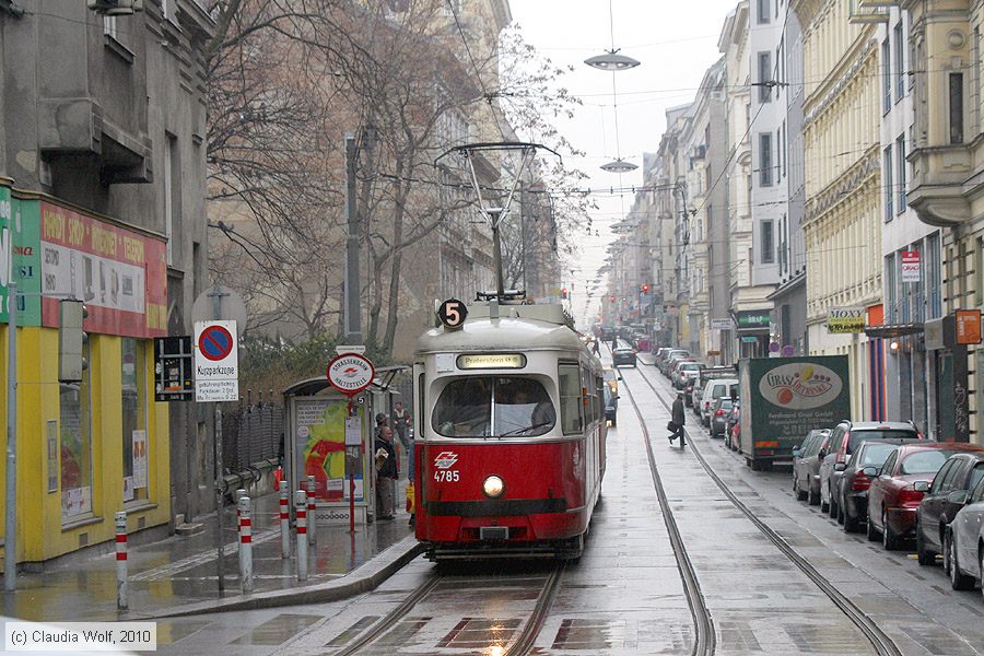 Wien - Straßenbahn - 4785 Triebwagen 4785 auf Linie 5 an der Haltestelle Lerchenfelder Straße, aufgenommen am 26. Februar 2010.