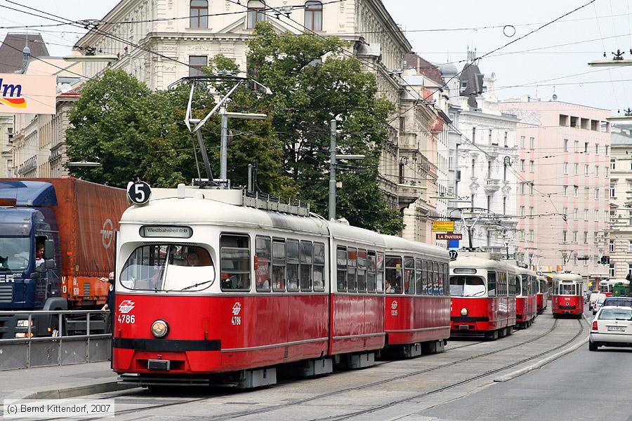 Wien - Straßenbahn - 4786 Triebwagen 4786 auf Linie 5 an der Haltestelle Spitalgasse / Währinger Straße am 10. August 2007.