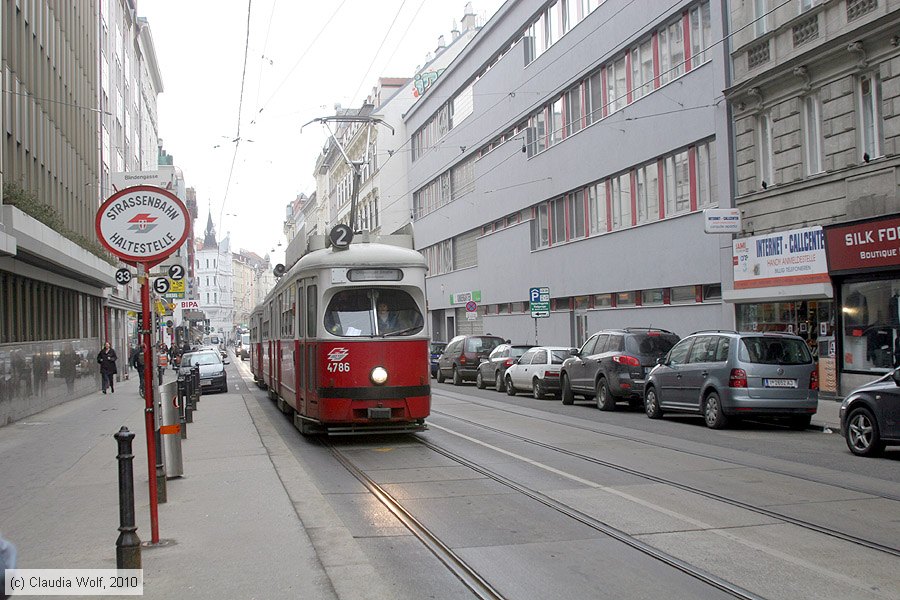 Wien - Straßenbahn - 4786 Triebwagen 4786 auf Linie 2 an der Haltestelle Blindengasse, aufgenommen am 26. Februar 2010.