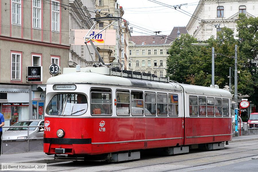 Wien - Straßenbahn - 4799 Triebwagen 4799 auf Linie 33 an der Haltestelle Spitalgasse / Währinger Straße am 10. August 2007. Das Fahrzeug des Typs E1 wurde im Jahr 1973 von SGP gebaut.