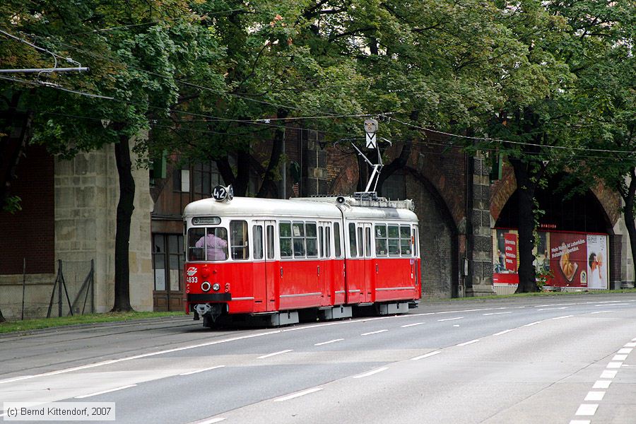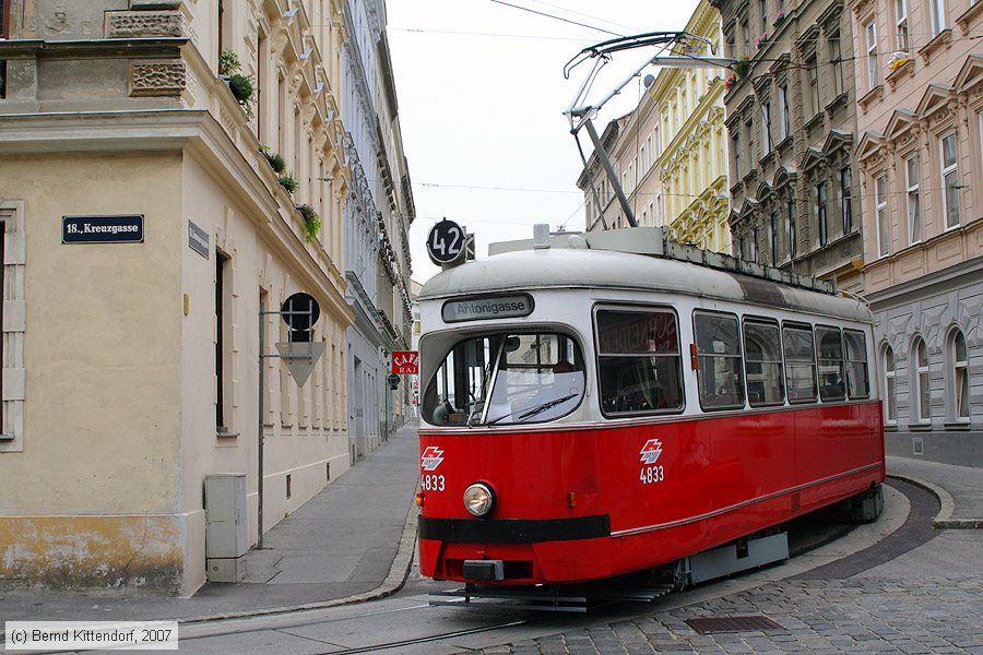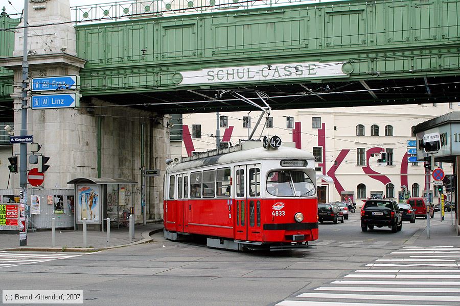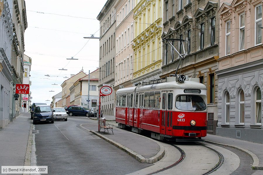 Wien - Straßenbahn - 4833 Triebwagen 4833 auf Linie 42 an der Haltestelle Vinzenzgasse am 10. August 2007.