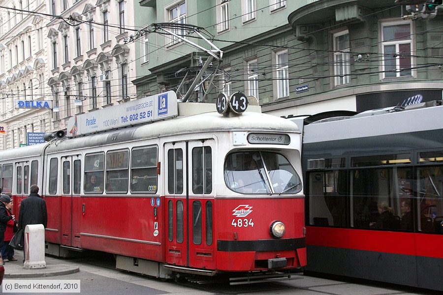Wien - Straßenbahn - 4834 Triebwagen 4834 auf Linie 43 bei der Haltestelle Lange Gasse am 26. Februar 2010.