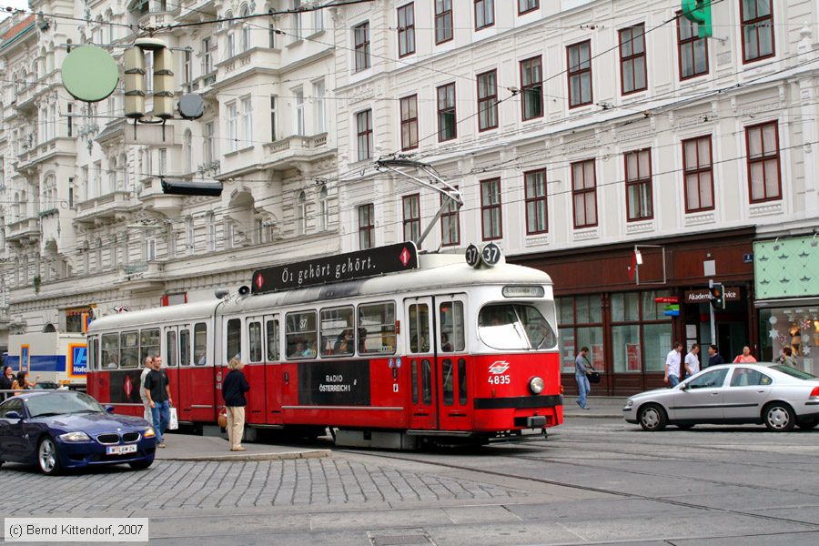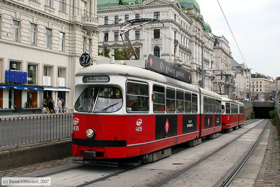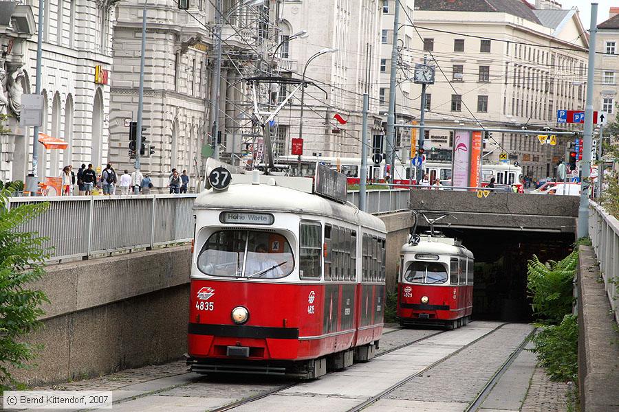 Wien - Straßenbahn - 4835 Triebwagen 4835 auf Linie 37 kurz nach Abfahrt an der unterirdischen Haltestelle Schottentor am 10. August 2007.