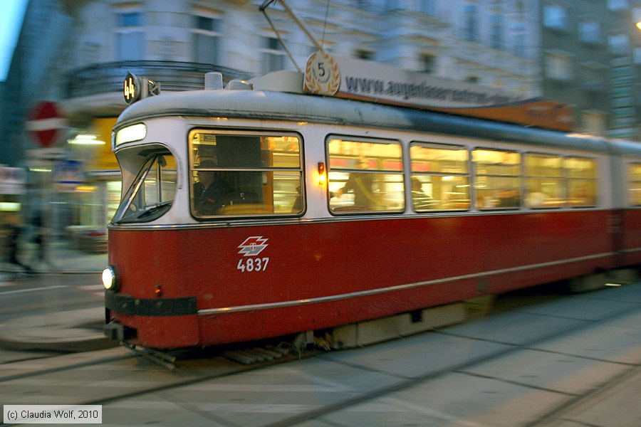 Wien - Straßenbahn - 4837 Triebwagen 4837 auf Linie 44 an der Haltestelle Brünnlbadgasse, aufgenommen am 22. Februar 2010.