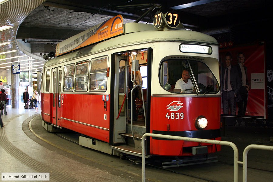 Wien - Straßenbahn - 4839 Triebwagen 4839 auf Linie 37 an der unterirdischen Haltestelle in der Schleife Schottentor am 10. August 2007.