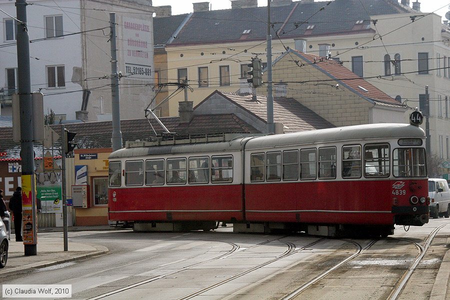 Wien - Straßenbahn - 4839 Triebwagen 4839 auf Linie 44 bei der Haltestelle Wilhelminenstraße - Sandleitengasse, aufgenommen am 23. Februar 2010.