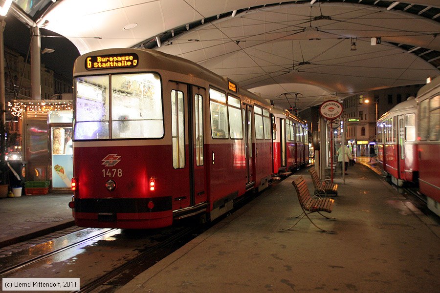 Wien - Straßenbahn - 1478 Beiwagen 1478 auf Linie 6 an der Haltestelle Urban Loritz Platz, aufgenommen am Abend des 18. März 2011.