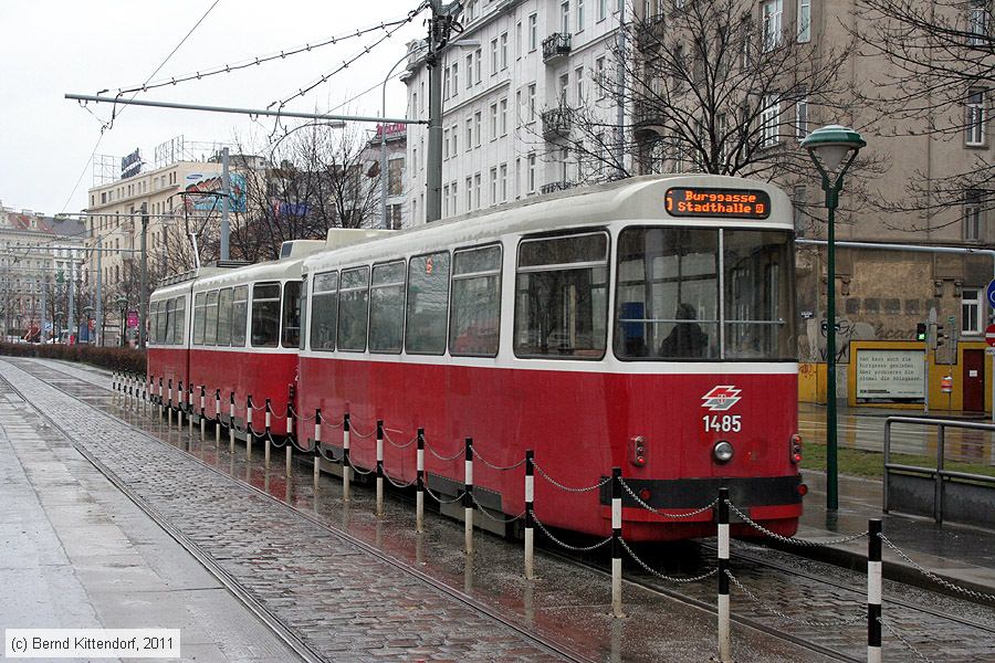 Wien - Straßenbahn - 1485 Beiwagen 1485 auf Linie 6 an der Haltestelle Mariahilfer Gürtel, aufgenommen am regnerischen 18. März 2011. Vorn am Zug war der Triebwagen 4085.