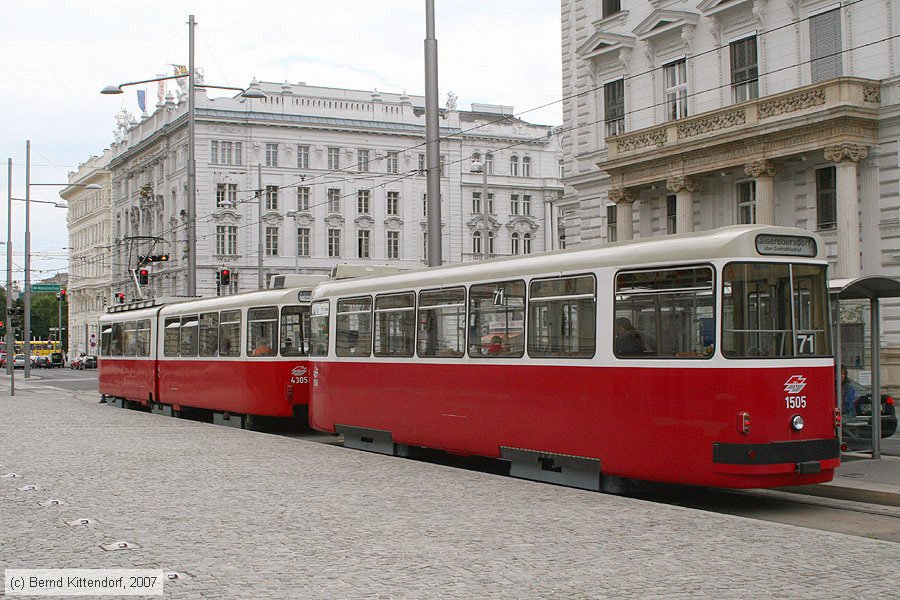 Wien - Straßenbahn - 1505 Beiwagen 1505 (am Triebwagen 4305) auf Linie 71 an der Haltestelle Schwarzenbergplatz am 10. August 2007.