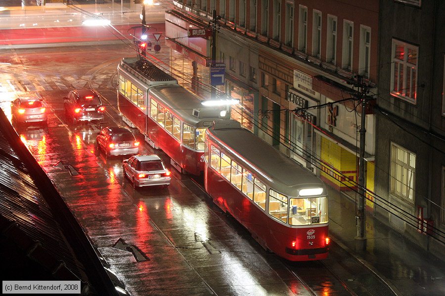 Wien - Straßenbahn - 1509 Beiwagen 1509 als Linie 67 bei der Ausfahrt aus dem Betriebshof Favoriten in der Gudrunstraße früh morgens am 16. September 2008.