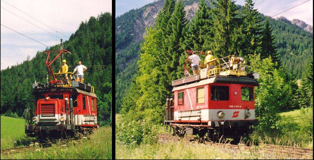 Austria/Heiterwang (near Reutte)// July 13,1998 around 09h30. ÖBB X534.32 /This special diesel vehicle is running to check the catenary (line Reutte --> Ehrwald). Front face and rear face. Photo and scan by Paul ROBERT (Belgium) {isims@arcadis.be} |