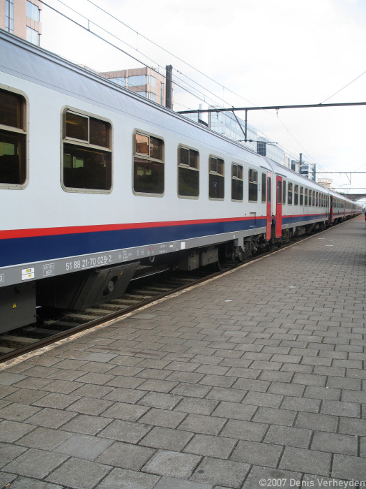 Refurbished I-10 2nd-class car (I10-B) of SNCB/NMBS, seen in the consist of D 13220 "Treski" (Innsbruck Hbf--->Oostende), upon arrival at Bruxelles-Midi/Brussel-Zuid.