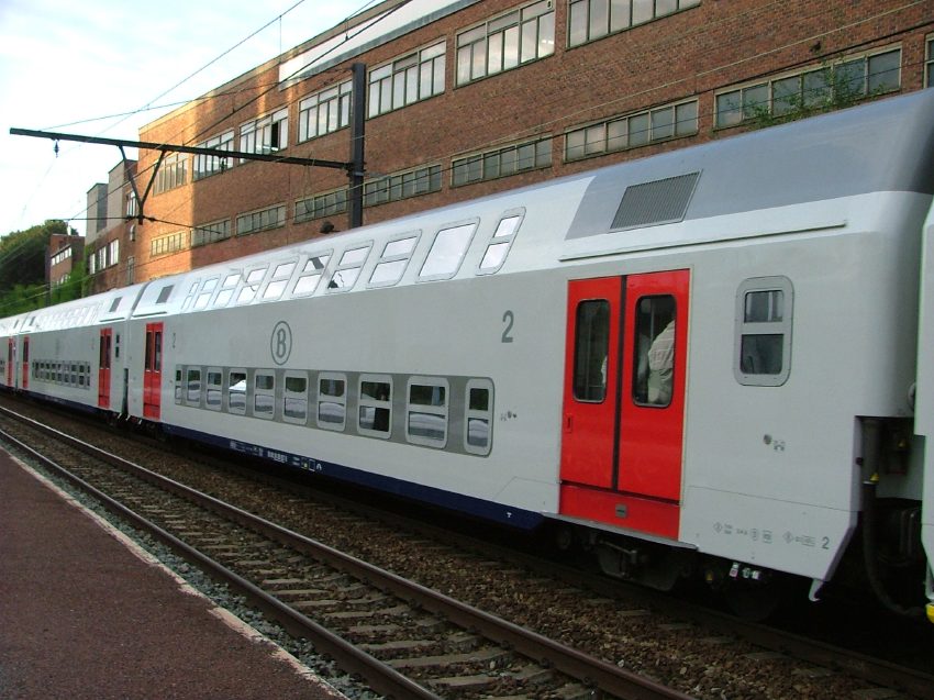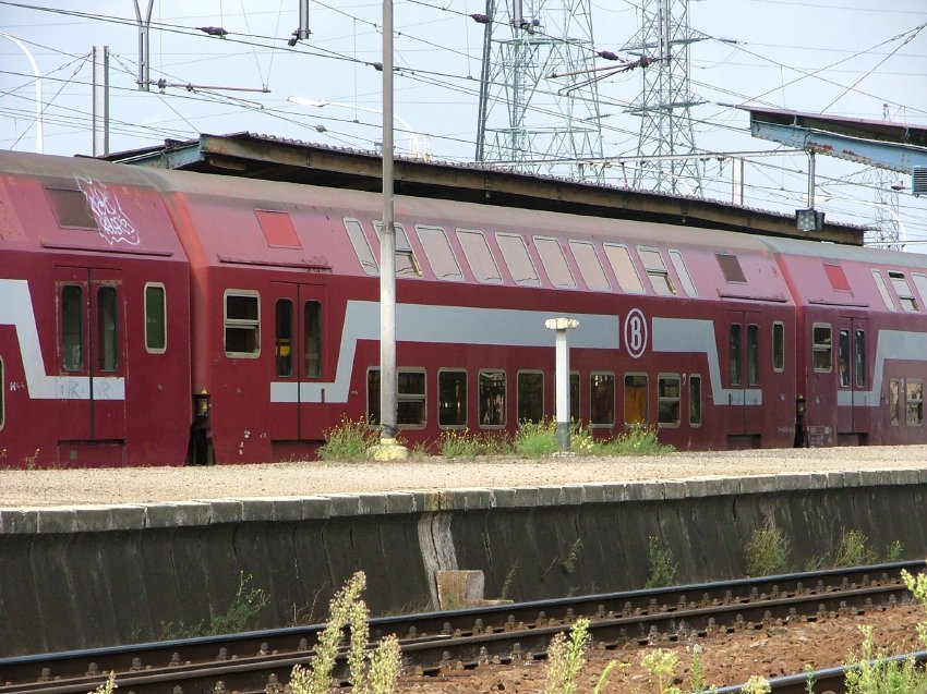 A second class double deck passenger car M6 of type "B", owned by SNCB (Societe Nationale des Chemins de fer Belges / Belgian Railways) at railway station Bruxelles Midi in composition of passenger train.