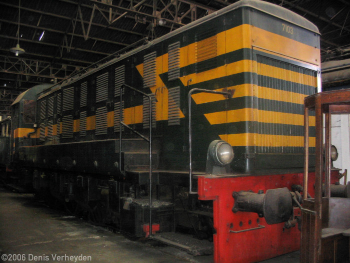 NMBS-SNCB HLR 7103 was seen stored at the railroadmuseum in Leuven. In the 1950s NMBS-SNCB ordered 11 heavy shunting locomotives from a consortium of Baume & Marpent (body), ACEC (electrical and mechanical part) and ABC (engine).Six were numbered in the 270 class (after 1971: HLR 70) and were equipped with a diesel-electric transmission.The other five were numbered in the 271 class (after 1971: HLR 71) and were equipped with a diesel-hydraulic transmission.While class 270/HLR 70 locomotives proved very successful and were in service until 2001, class 271/HLR 71 locomotives were very unreliable and were already withdrawn in 1980. Leuven , 06/07/2006. Photo by : Denis Verheyden (msts_2@hotmail.com) |