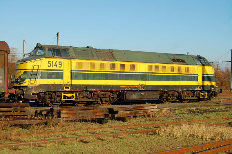 | The belgian museum train organisation PTF/TSP ownes four (!) ex-NMBS Reeks 51 Diesel locos, of which 5149 stands here in front of the TSP/PTF loco shed in Saint-Ghislain on 12 september 2004. Scanned picture by Leon2711schrijvers@yahoo.co.uk |