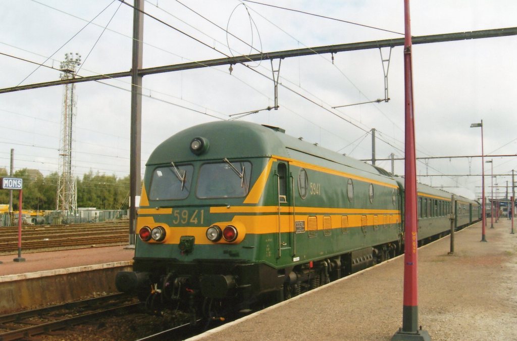 | On 12 September 2009, TSP/PTF 5941 pushed a steam-pulled extra train out of Mons. Scanned photo by Leon Schrijvers Leon2711schrijvers@yahoo.co.uk |