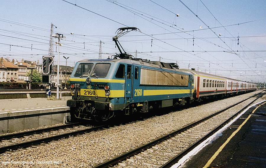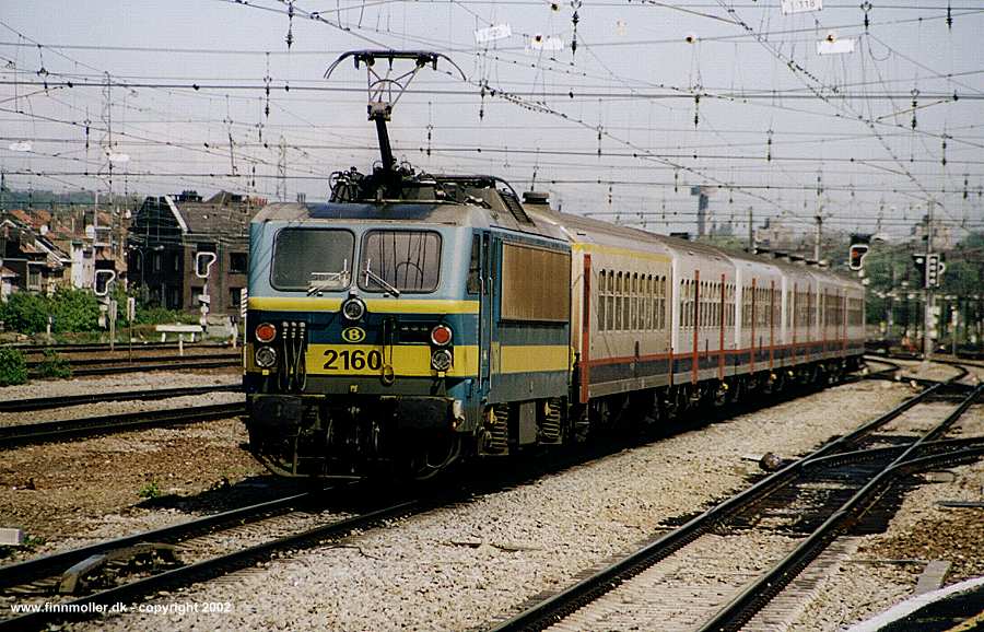 Electric locomotive 2160 with a push-pull train in Bruxelles Nord, April 29, 2002. Photo by Finn Møller finnmoller@hotmail.com More pictures at http://www.finnmoller.dk |