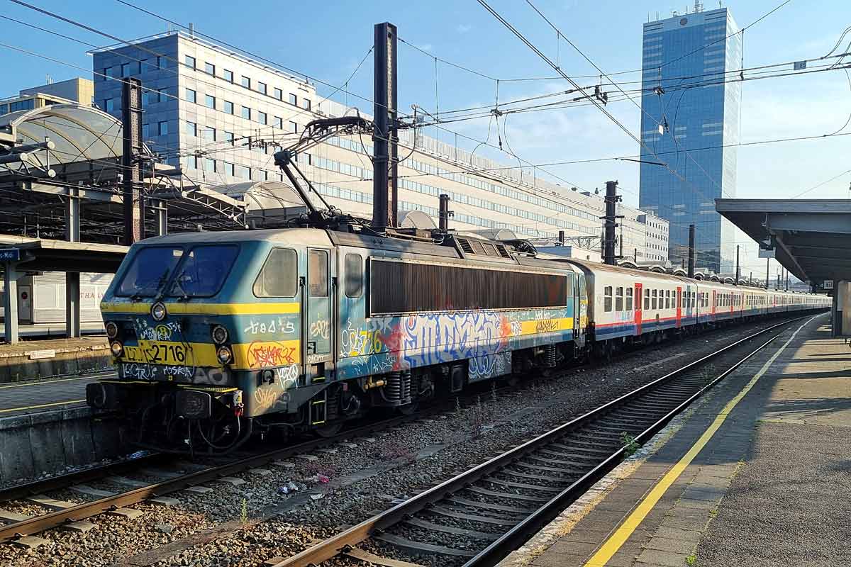 NMBS 2716 with train 240 "Ost-West-Express" (Moskwa/Warszawa-Brussel) in Verviers Central, 28-3-1997. Photo and scan by E. Konijnendijk. |