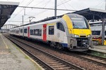 An EMU AM08, owned by SNCB (Societe Nationale des Chemins de fer Belges / Belgian Railways) at railway station Bruxelles Midi, using a passenger train.