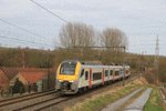 EMU 08074 as passenger train L3882 between Leuven and Braine-le-Comte, is passing in Hennuyères on line 96, 17 April 2014.