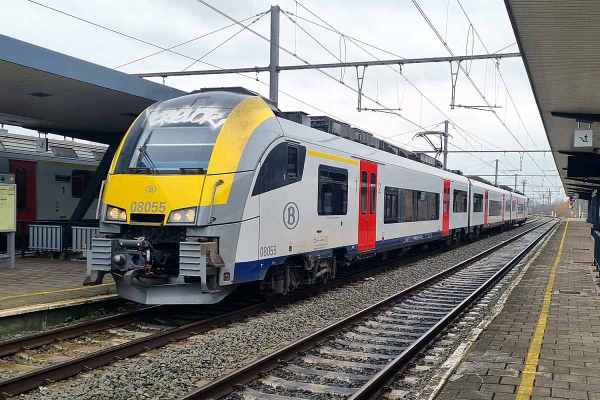 NMBS/SNCB EMU-3 Class AM 08-055 (NVR 94 88 008 055 1-7 B-B) at Lokeren Station Belgium on 20/03/2023.