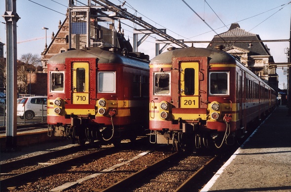 L'automtrice AM62 n°201 au côté de l'automotrice AM74 n°710 en gare de Tournai, le