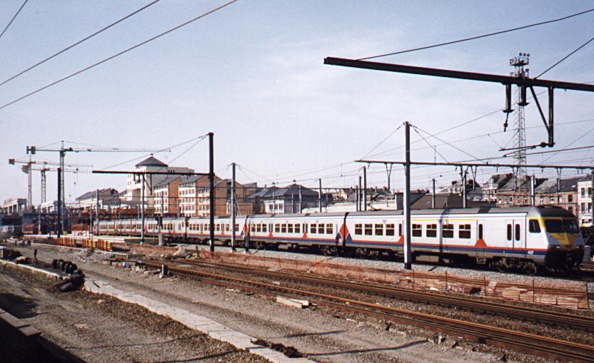 Belgium SNCB/NMBS EMU 437 + ... Namur 03/1999. IC Brussels Luxembourg. Photo and scan Guy Demeulder (guy.demeulder@skynet.be). |