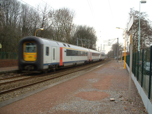 Un AM 96 de la SNCB traverse sans arrêt la halte SNCF du Pont de Bois, en direction de Lille et en provenance de Tournai ou Liège.