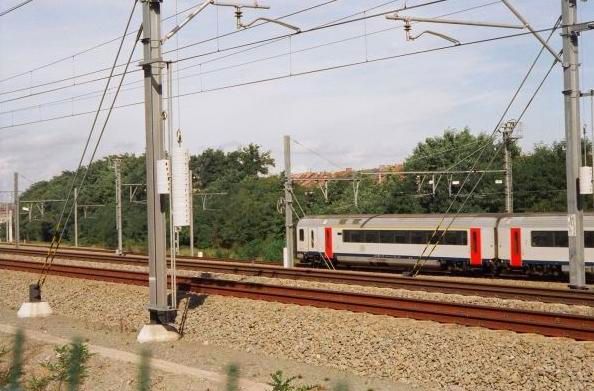 | An unidentified AM96 3-car EMU speeding along the rock cliffs alongside the river Meuse near Marche-les-Dames on it's way from Liege Palais to Lille Flandres Marche les Dames, line Namur - Liege (line 125), Saturday 14th of July 2008 By Jonathan Stam (Jonathan_stam@mail2world.com) |