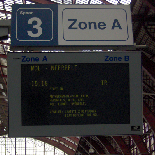 Television screen in Antwerpen Centraal showing details for the next departing train. It says that the last two coaches are reduced to Mol instead of Neerpelt. 22.01.2005 Photo by Thomas van Berkel |