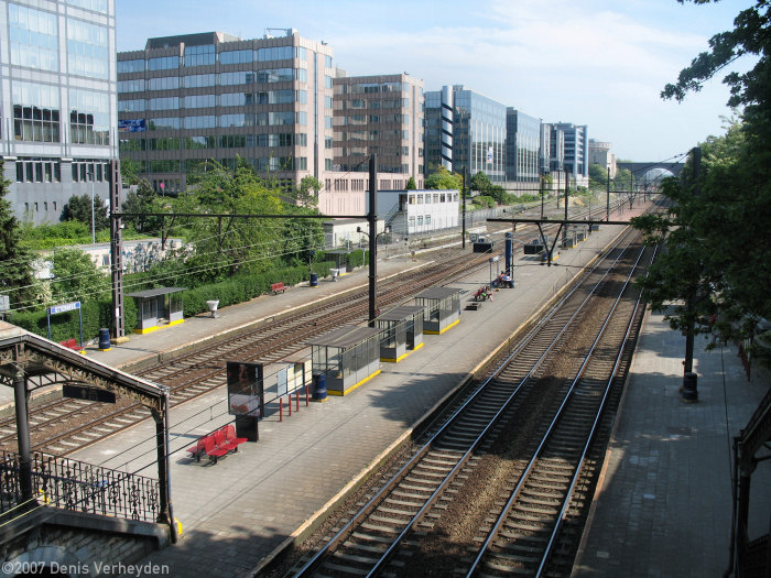 View on the platforms of Etterbeek station , looking southwards towards Ottignies.This photo was taken from the footbridge which connects the stationbuilding with the platforms. Etterbeek , 05/05/2007. Photo by : Denis Verheyden |