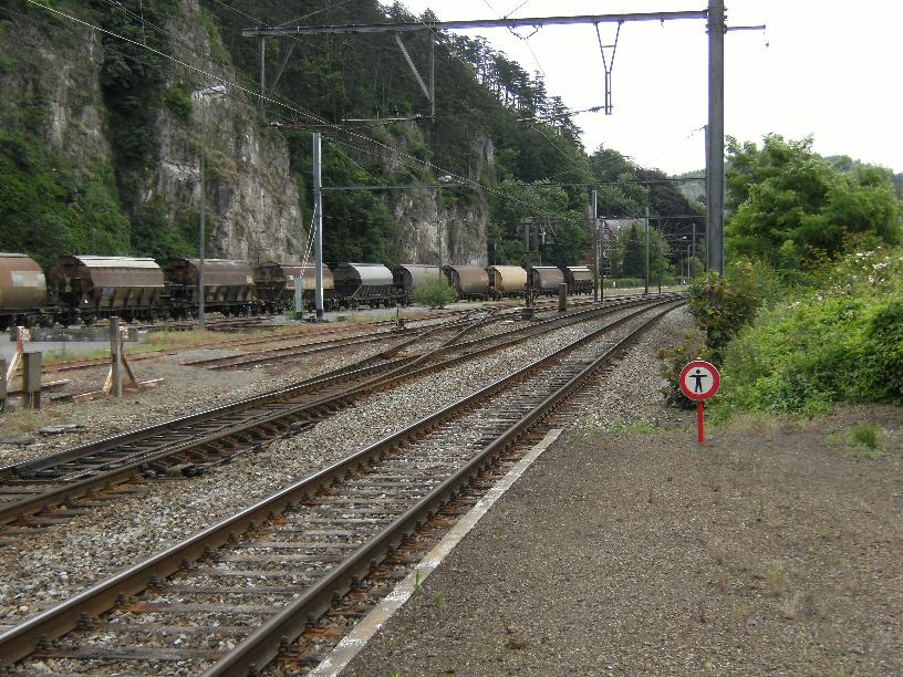 | A small freight yard at Marche les Dames station. This freight yard serves a nearby chalk mine, hence the chalk hoppers at the yard. Marche les Dames, line Namur-Liege (line 125), Saturday 14th of July 2008 by Jonathan Stam (Jonathan_stam@mail2world.com) |
