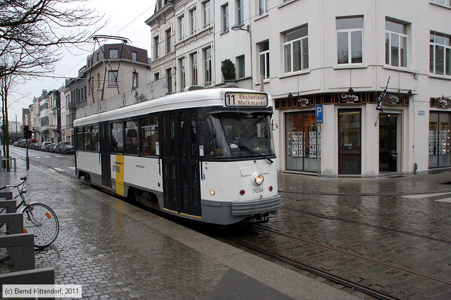 Straßenbahn Antwerpen - 7034 Triebwagen 7034 auf Linie 11 an der Haltestelle Dageraadplaats, aufgenommen am 26. Februar 2011.