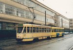 Tramways 7044 and 7067 on line 56b between CERIA and Gare du Midi, are waiting for departure at the terminus avenue Gryson, on 18 march 1994.