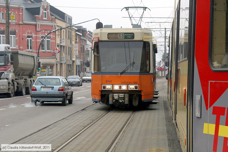 Charleroi - TEC - 6141 Triebwagen 6141 auf Linie 88 an der Haltestelle Anderlues Monument, aufgenommen am 23. Februar 2011. Die Fahrgäste steigen an dieser Haltestelle in Fahrtrichtung links aus und überqueren das Gleis vor dem wartenden Zug der Gegenrichtung.
