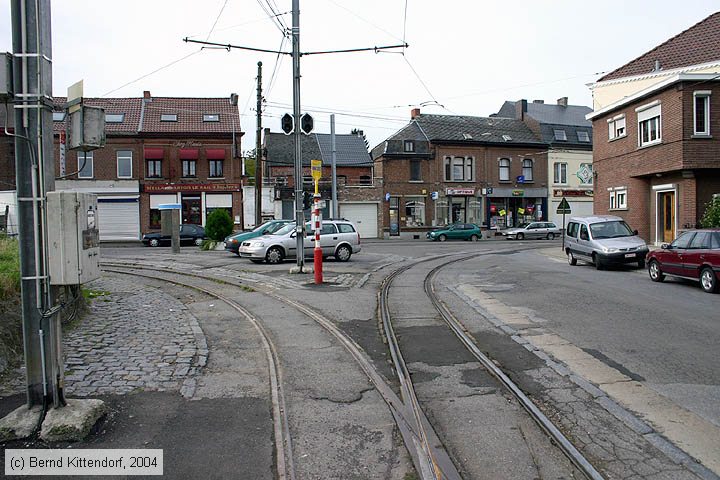 Charleroi - TEC - Haltestelle Haltestelle Jonction in Anderlues am 20. September 2004. Die Züge der Linien 88 und 89 fahren rechts Richtung Rue de la Station weiter.