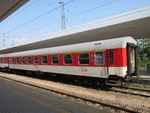 A first class passenger car of class 40 (type "Ame") at central railway station Sofia in composition of fast train "Diana" with number 8640 from Stara Zagora.