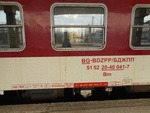 A second class passenger car of class 40 (type "Bme") with personal number 51 52 20 40 026 - 8 , standing on central railway station Plovdiv in composition of the fast train with number IR 8613 Inter Regio from Sofia to Varna.This train carries a directly passenger cars to Burgas.