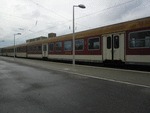 A second class passenger car of class 33 (Byuu) with personal number 50 52 21 33 026 - 7 standing on railway station Pazardjik in composition of fast train from Burgas to Sofia.Explanation of the numbers: "50" - passenger car with perennial wheel base , non sertificied to UIC / RIC and used by inwardly announcement device ; "52" - the ID number of BDZ (Bulgarian Railways) ; "21" - second class passenger car with 11 compartments or 22 - 23 rows ; "33" - class of passenger car - it`s determined by the 140 km per hour and 2 kinds of heating - steam heating and alternating current of electricity 1000V ~ 16 2/3 Hz. ; "026" - number of the unit ; "7" is the control digit.