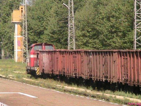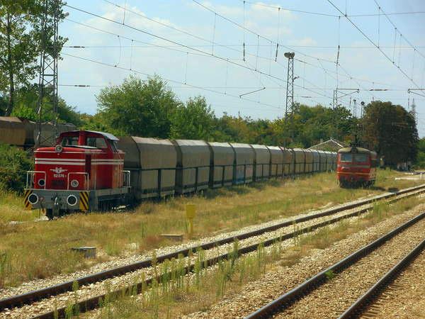 A shunting lokomotive of class 52 pulls a freight train on railway station Stamboliiski. Digital photo Veselin Malinov, e-mail: veso_bog@abvbg |